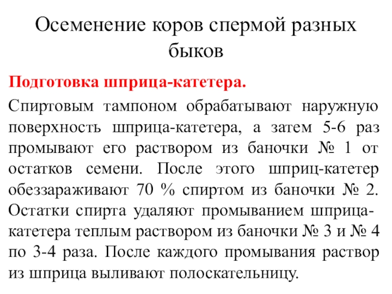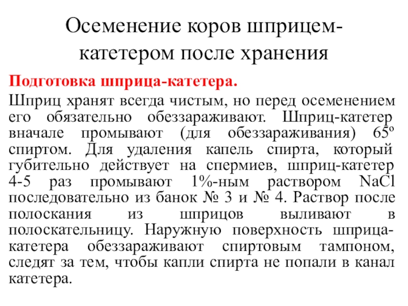 перед осеменением его обязательно обеззараживают. Шприц-катетер вначале промывают (для обеззараживания) 65º спиртом. Для удаления капель спирта, который губительно действует на спермиев, шприц-катетер 4-5 раз промывают 1%-ным раствором NaCl последовательно из банок № 3 и № 4. Раствор после полоскания из шприцов выливают в полоскательницу. Наружную поверхность шприца-катетера обеззараживают спиртовым тампоном, следят за тем, чтобы капли спирта не попали в канал катетера.
