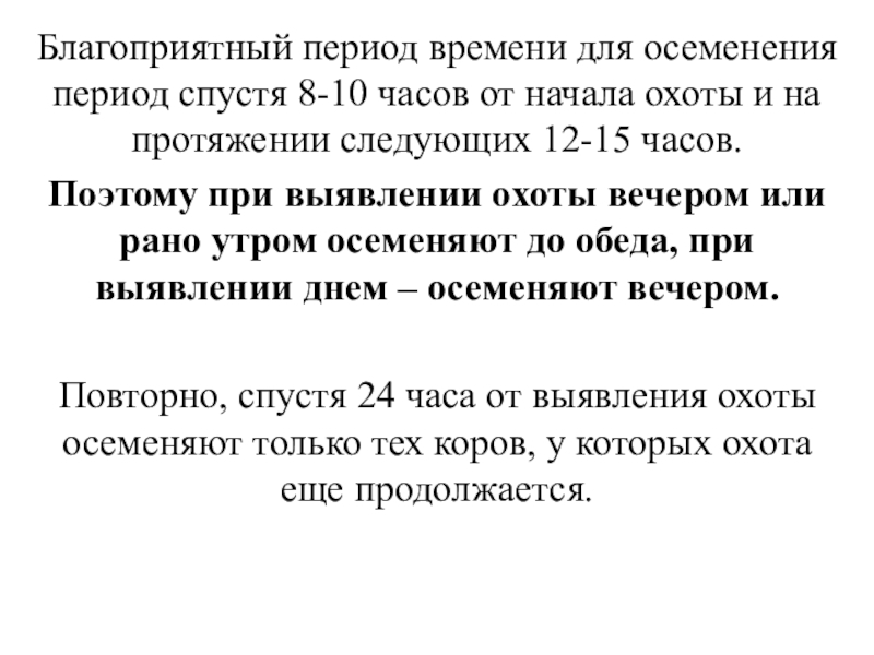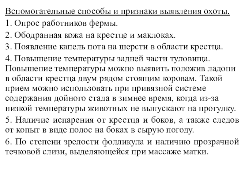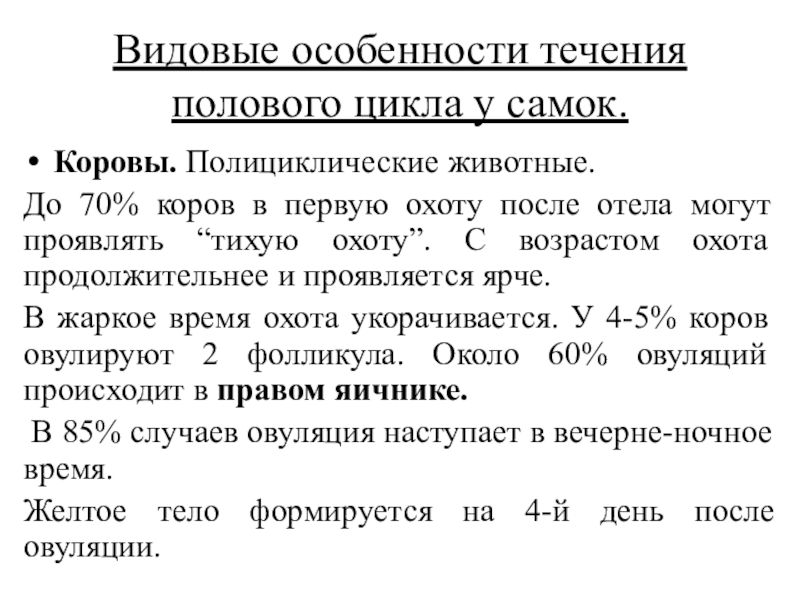 В жаркое время охота укорачивается. У 4-5% коров овулируют 2 фолликула. Около 60% овуляций происходит в правом яичнике.