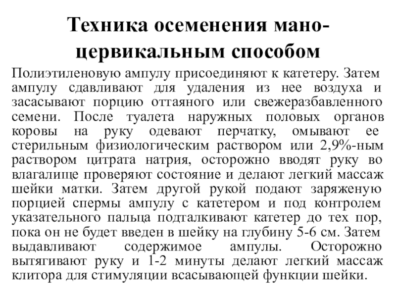 для удаления из нее воздуха и засасывают порцию оттаяного или свежеразбавленного семени. После туалета наружных половых органов коровы на руку одевают перчатку, омывают ее стерильным физиологическим раствором или 2,9%-ным раствором цитрата натрия, осторожно вводят руку во влагалище проверяют состояние и делают легкий массаж шейки матки. Затем другой рукой подают заряженую порцией спермы ампулу с катетером и под контролем указательного пальца подталкивают катетер до тех пор, пока он не будет введен в шейку на глубину 5-6 см. Затем выдавливают содержимое ампулы. Осторожно вытягивают руку и 1-2 минуты делают легкий массаж клитора для стимуляции всасывающей функции шейки.