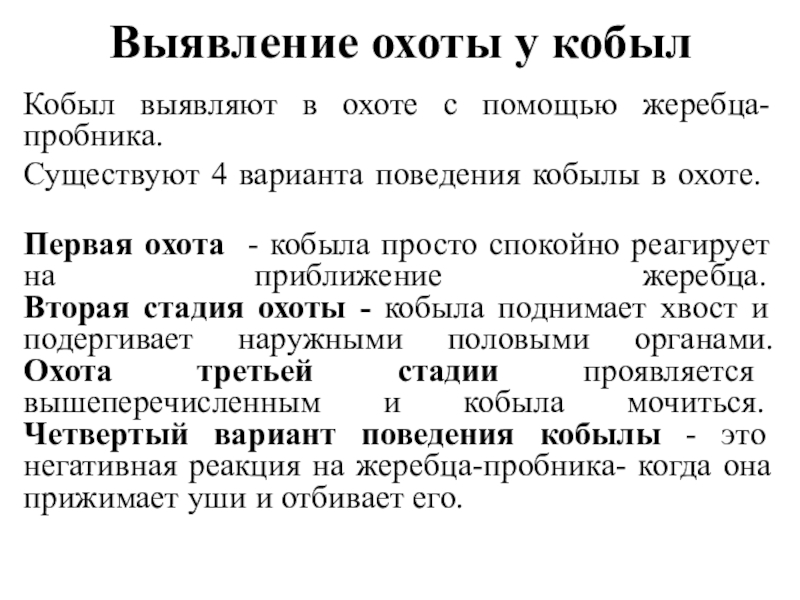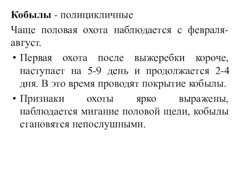 охота после выжеребки короче, наступает на 5-9 день и продолжается 2-4 дня. В это время проводят покрытие кобылы.