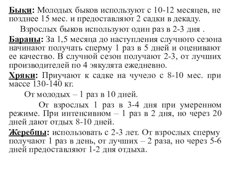 на производителя с 35-40 коров при вольной случке до 5-7 тысяч при ИО, с 20-25 до 300-500 кобыл, с 10-12 до 200-250 свиноматок;