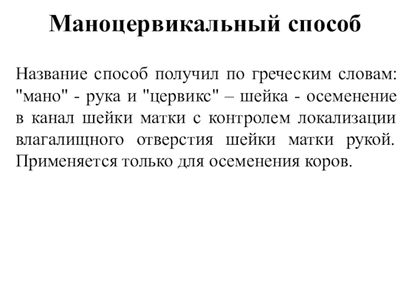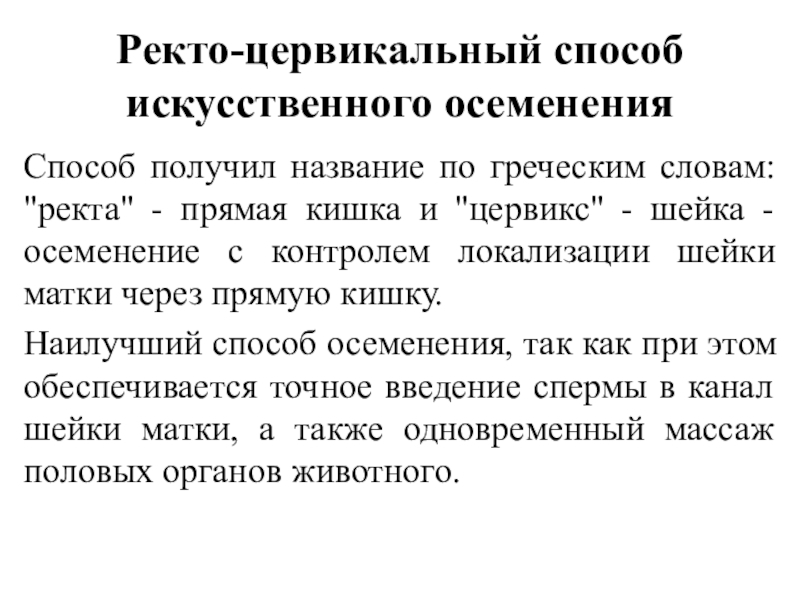 и "цервикс" – шейка - осеменение в канал шейки матки c контролем локализации влагалищного отверстия шейки матки рукой. Применяется только для осеменения коров.