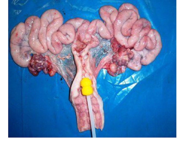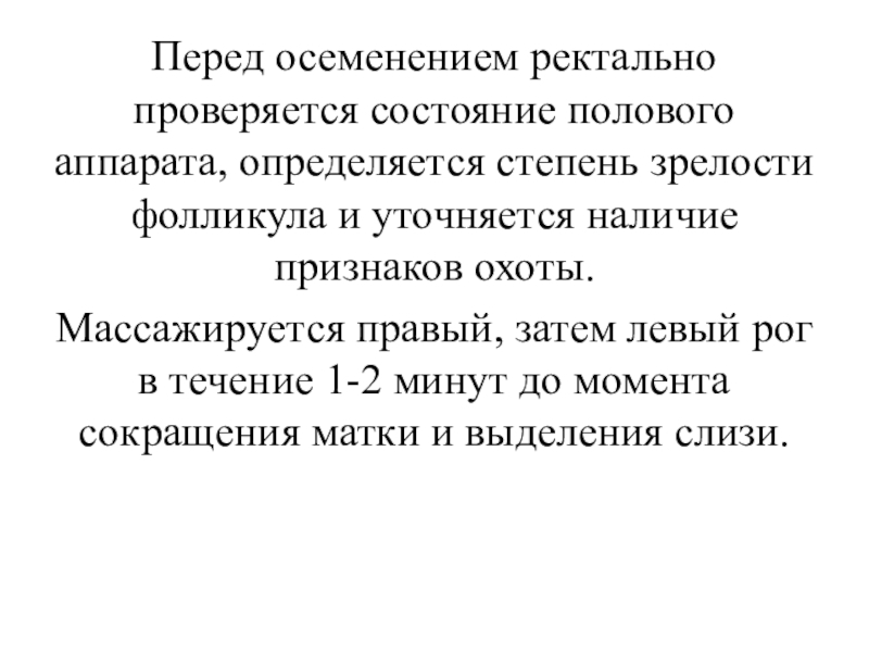 6. Осуществляется массаж тела и рогов матки, что приводит к ее сокращению. При сокращении матки выделяется слизь, по внешнему виду которой можно судить о наличии или отсутствии воспалительных процессов в матке;