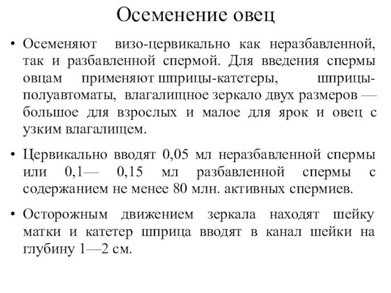 Осеменяют визо-цервикально как неразбавленной, так и разбавленной спермой. Для введения