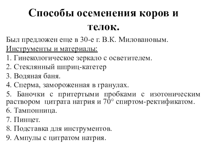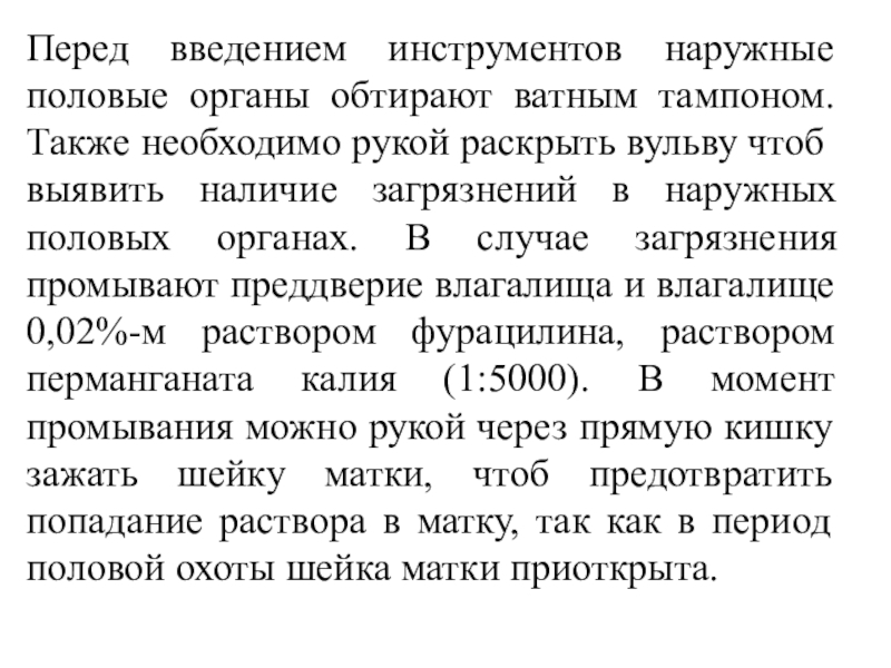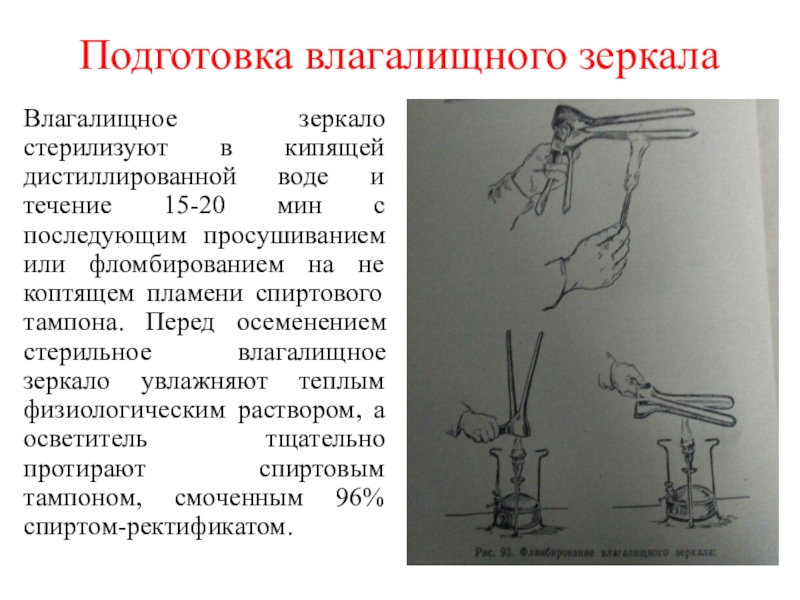 15-20 мин с последующим просушиванием или фломбированием на не коптящем пламени спиртового тампона. Перед осеменением стерильное влагалищное зеркало увлажняют теплым физиологическим раствором, а осветитель тщательно протирают спиртовым тампоном, смоченным 96% спиртом-ректификатом.