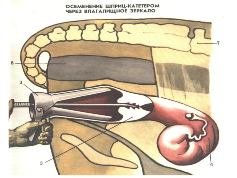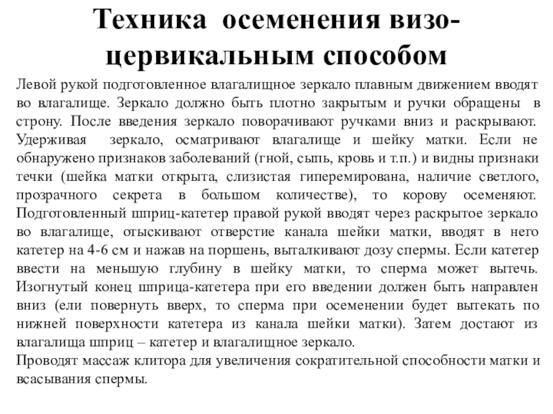 во влагалище. Зеркало должно быть плотно закрытым и ручки обращены в строну. После введения зеркало поворачивают ручками вниз и раскрывают. Удерживая зеркало, осматривают влагалище и шейку матки. Если не обнаружено признаков заболеваний (гной, сыпь, кровь и т.п.) и видны признаки течки (шейка матки открыта, слизистая гиперемирована, наличие светлого, прозрачного секрета в большом количестве), то корову осеменяют. Подготовленный шприц-катетер правой рукой вводят через раскрытое зеркало во влагалище, отыскивают отверстие канала шейки матки, вводят в него катетер на 4-6 см и нажав на поршень, выталкивают дозу спермы. Если катетер ввести на меньшую глубину в шейку матки, то сперма может вытечь. Изогнутый конец шприца-катетера при его введении должен быть направлен вниз (ели повернуть вверх, то сперма при осеменении будет вытекать по нижней поверхности катетера из канала шейки матки). Затем достают из влагалища шприц – катетер и влагалищное зеркало.