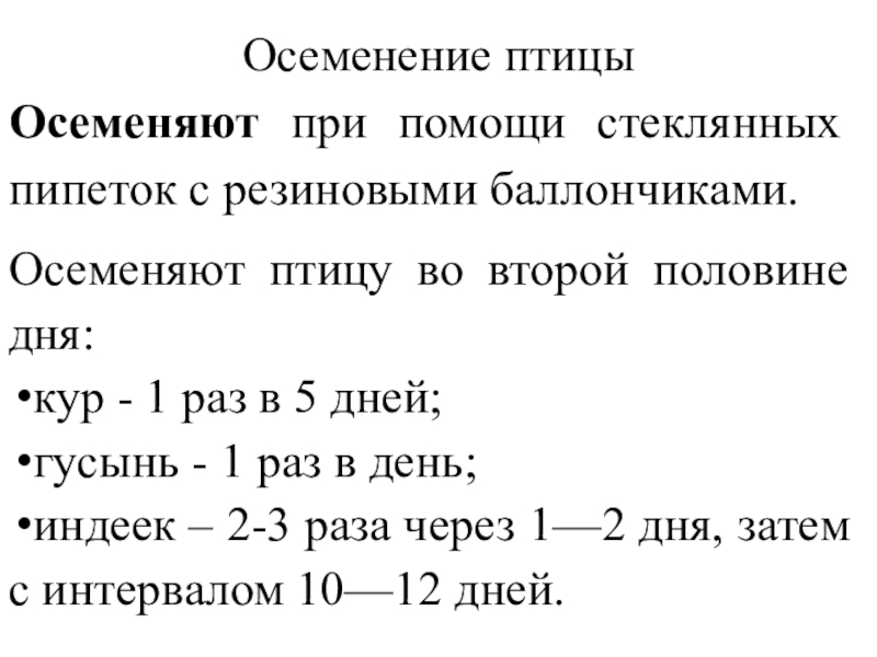 индейкам – 0,025 – 0,03 мл неразбавленной спермы с количеством 80 – 100 млн. спермиев в дозе и активностью не ниже 7 баллов.