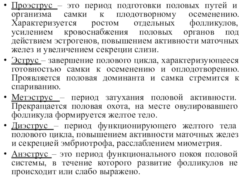 плодотворному осеменению. Характеризуется ростом отдельных фолликулов, усилением кровоснабжения половых органов под действием эстрогенов, повышением активности маточных желез и увеличением секреции слизи.