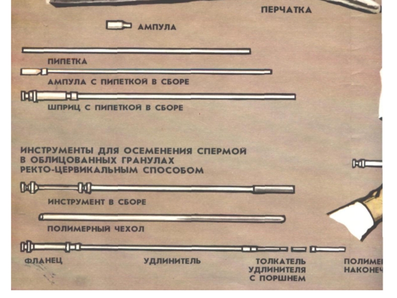 резиновый катетер И. И. Иванова, соединенный со стеклянным шприцем емкостью 20—30 мл. Конец катетера вводят в канал шейки матки рукой на глубину 10-12 см. Присоединив к катетеру шприц со спермой, медленно выталкивают сперму при помощи поршня. После осеменения катетер вынимают.
