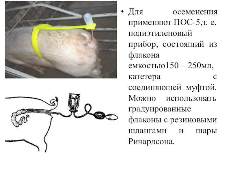 Слайд 141Для осеменения применяют ПОС-5,т. е. полиэтиленовый прибор, состоящий из флакона емкостью150—250мл, катетера