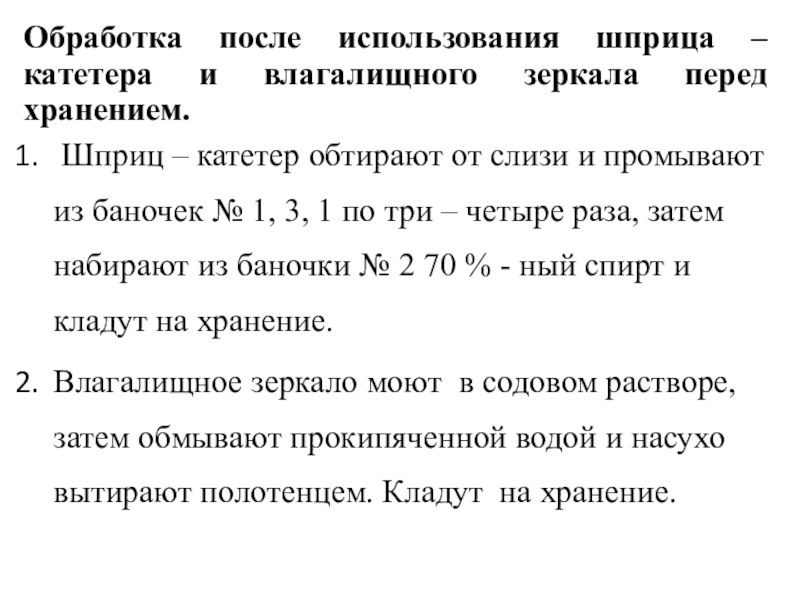 Слайд 127Обработка после использования шприца – катетера и влагалищного зеркала перед хранением.