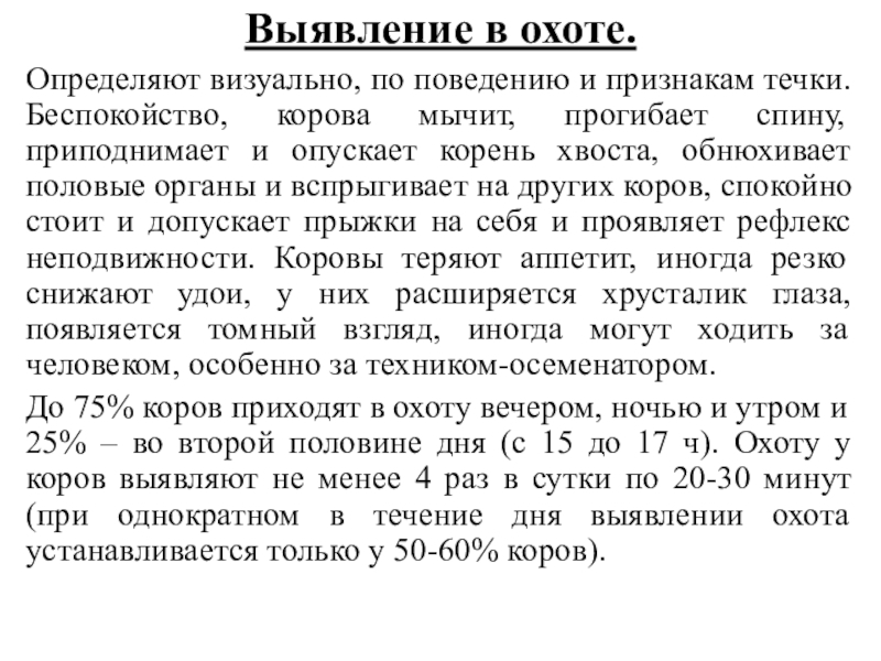 70% коров в первую охоту после отела могут проявлять “тихую охоту”. С возрастом охота продолжительнее и проявляется ярче.