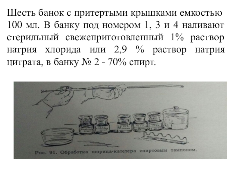Шприц – катетер обтирают от слизи и промывают из баночек № 1, 3, 1 по три – четыре раза, затем набирают из баночки № 2 70 % - ный спирт и кладут на хранение.