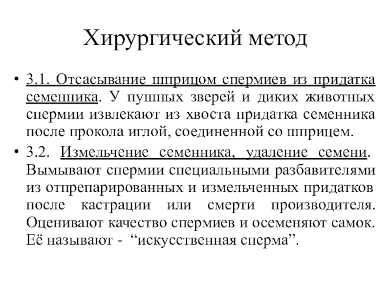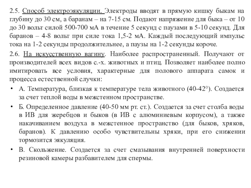 1.2. Губочный. Обеззараженную греческую губку вводят во влагалище. После садки. губку извлекают и выжимают сперму рукой или прессом.