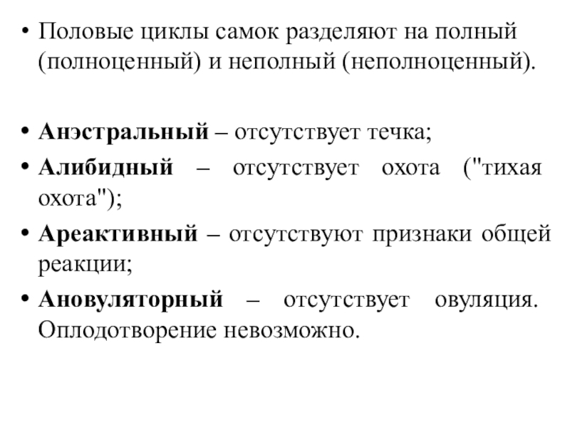 Слайд 10Половые циклы самок разделяют на полный (полноценный) и неполный (неполноценный).
