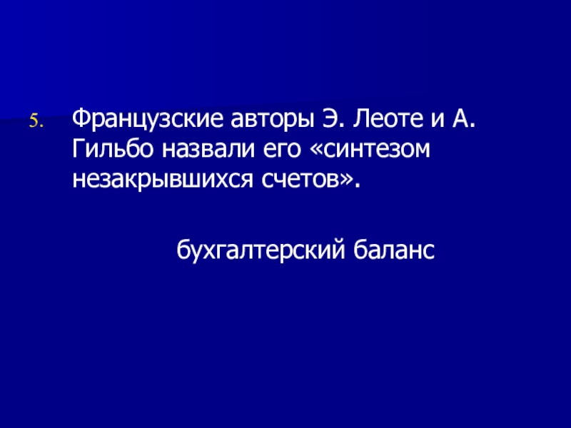 Французские авторы Э. Леоте и А. Гильбо назвали его «синтезом незакрывшихся счетов».					бухгалтерский баланс