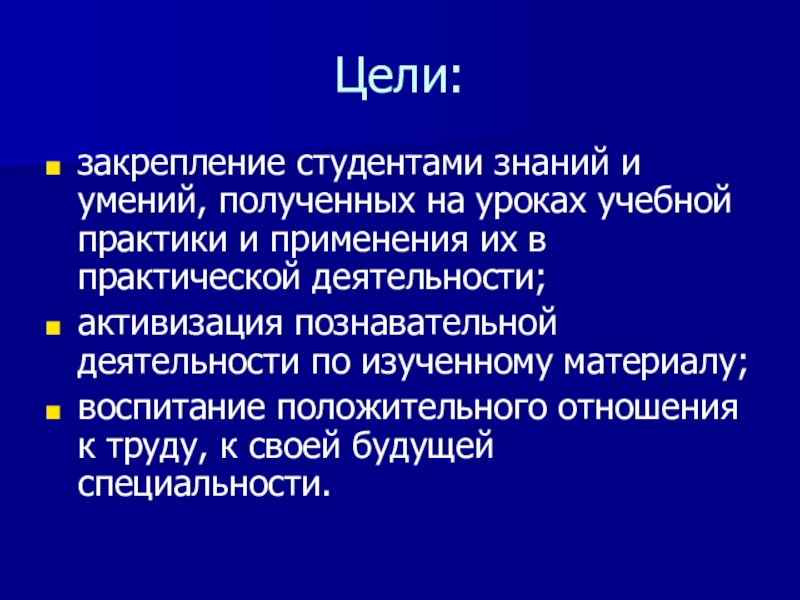 Цели:закрепление студентами знаний и умений, полученных на уроках учебной практики и применения их в практической деятельности; активизация познавательной деятельности по изученному материалу;воспитание положительного отношения к труду, к своей будущей специальности.