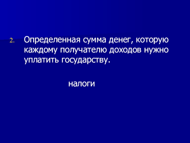 Определенная сумма денег, которую каждому получателю доходов нужно уплатить государству.						налоги