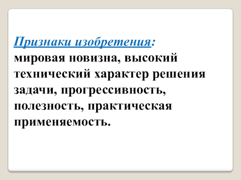 Слайд 12Признаки изобретения: мировая новизна, высокий технический характер решения задачи, прогрессивность, полезность,