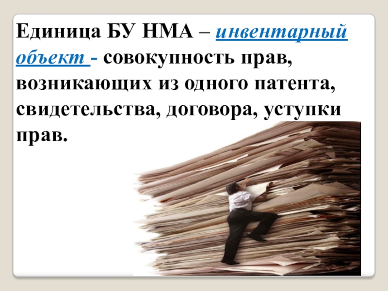 Слайд 9Единица БУ НМА – инвентарный объект - совокупность прав, возникающих из
