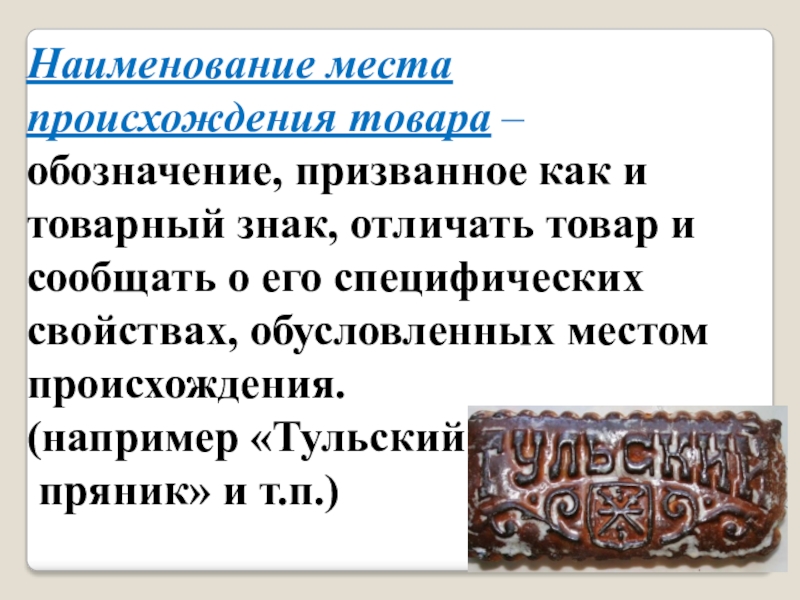 Слайд 17Наименование места происхождения товара – обозначение, призванное как и товарный знак,