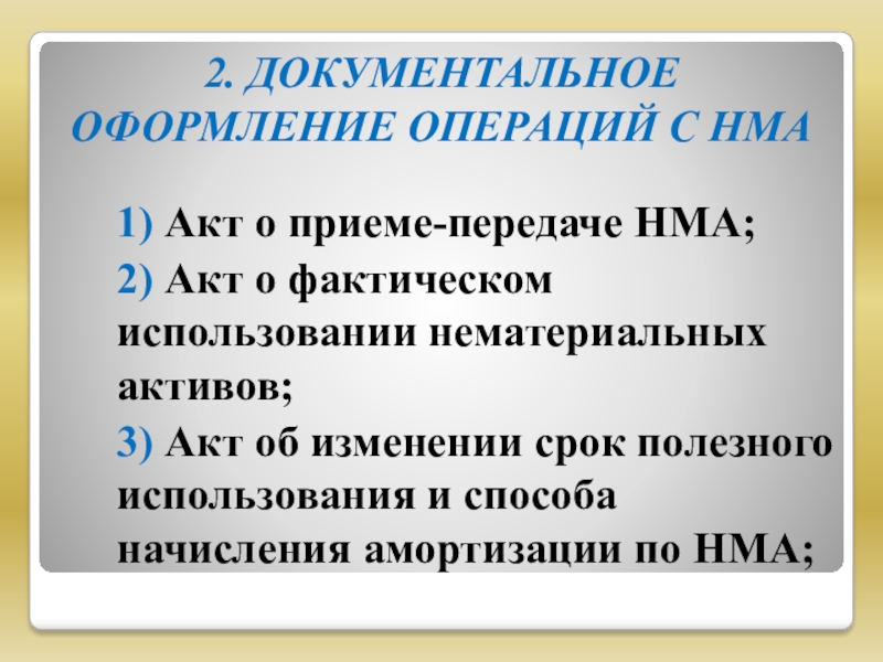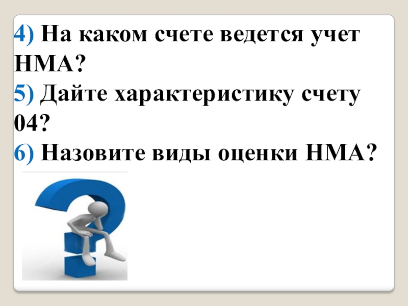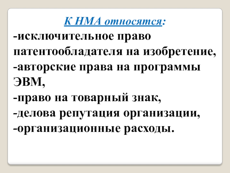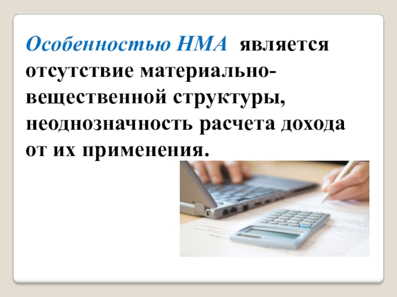 Слайд 5Особенностью НМА является отсутствие материально-вещественной структуры, неоднозначность расчета дохода от их