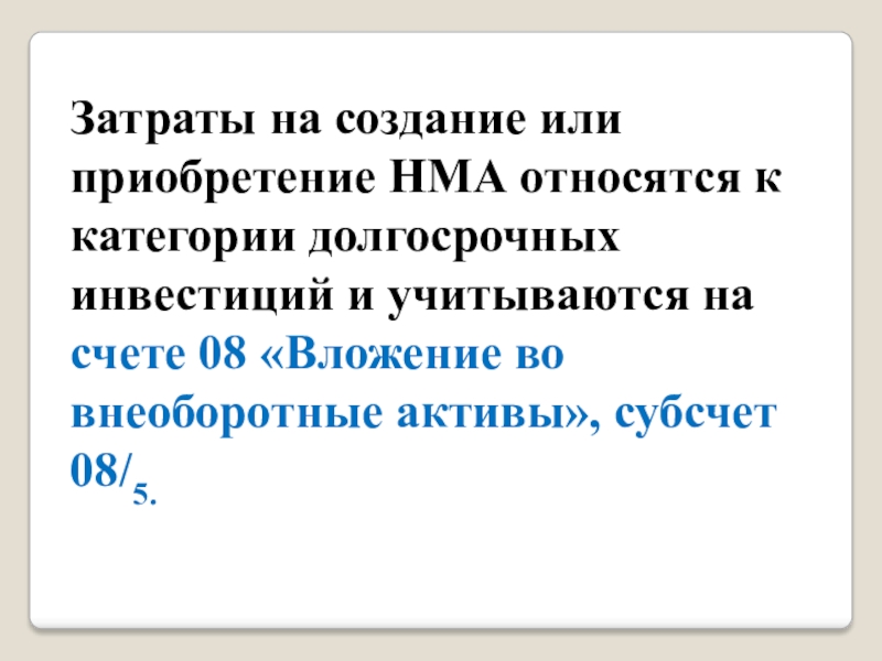 Слайд 27Затраты на создание или приобретение НМА относятся к категории долгосрочных инвестиций