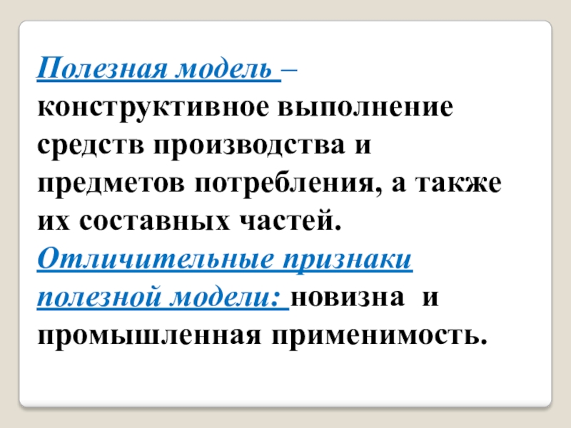 Слайд 14Полезная модель – конструктивное выполнение средств производства и предметов потребления, а