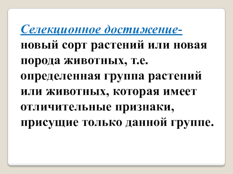Слайд 15Селекционное достижение- новый сорт растений или новая порода животных, т.е. определенная