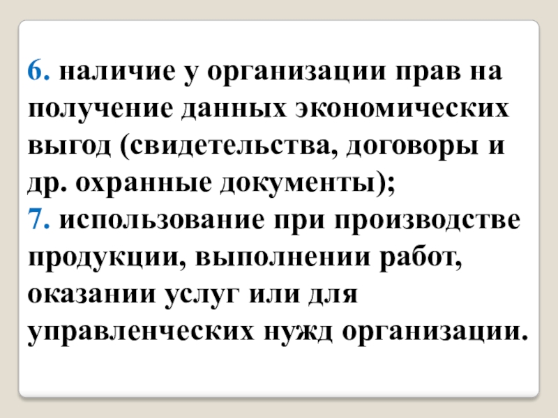 Слайд 86. наличие у организации прав на получение данных экономических выгод (свидетельства,