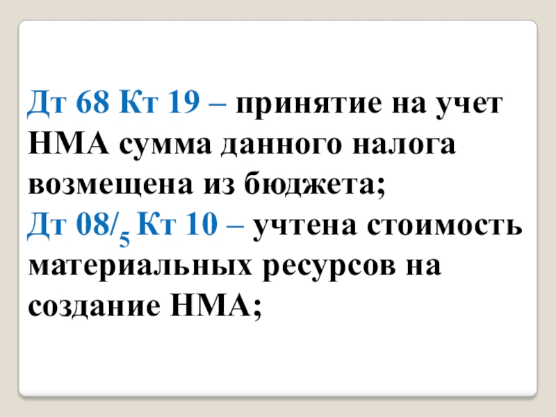 Слайд 34Дт 68 Кт 19 – принятие на учет НМА сумма данного