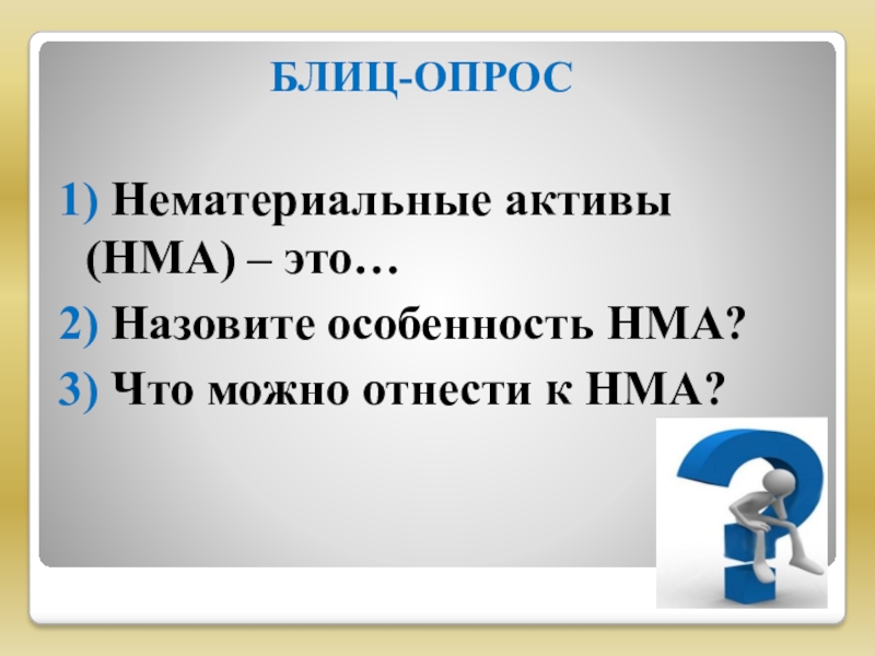 Слайд 3Нематериальные активы (НМА) -это стоимость объектов промышленной и интеллектуальной собственности