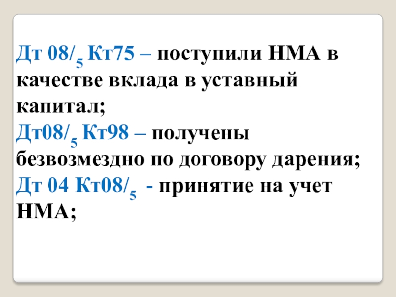 Слайд 37Дт 08/5 Кт75 – поступили НМА в качестве вклада в уставный