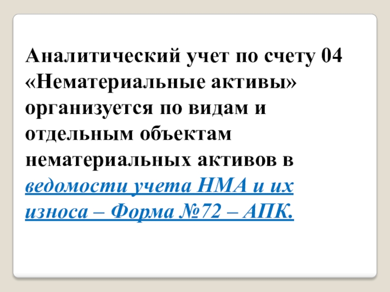 отдельным объектам нематериальных активов в ведомости учета НМА и их износа – Форма №72 – АПК.