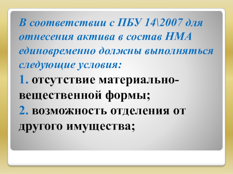 Слайд 6В соответствии с ПБУ 14\2007 для отнесения актива в состав НМА
