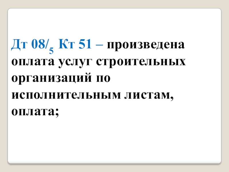 Слайд 36Дт 08/5 Кт 51 – произведена оплата услуг строительных организаций по