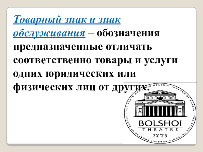 Слайд 16Товарный знак и знак обслуживания – обозначения предназначенные отличать соответственно товары