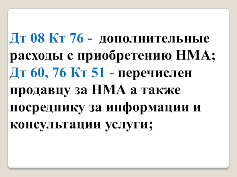 Слайд 38Дт 08 Кт 76 - дополнительные расходы с приобретению НМА;