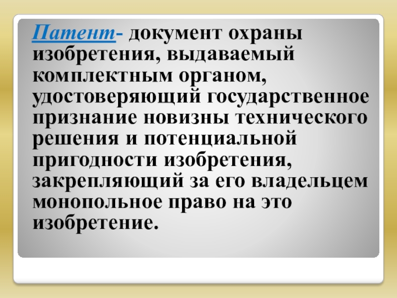 Слайд 10Патент- документ охраны изобретения, выдаваемый комплектным органом, удостоверяющий государственное признание новизны