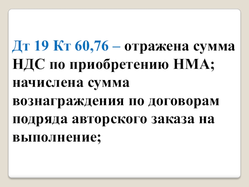 Слайд 33Дт 19 Кт 60,76 – отражена сумма НДС по приобретению НМА;