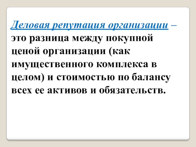 Слайд 18Деловая репутация организации – это разница между покупной ценой организации (как