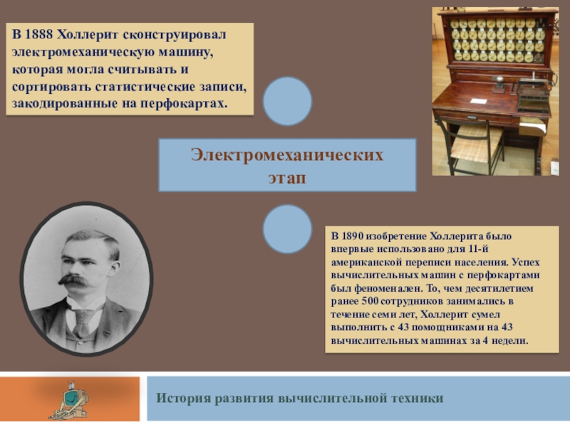 В 1888 Холлерит сконструировал электромеханическую машину, которая могла считывать и сортировать статистические записи, закодированные на перфокартах.