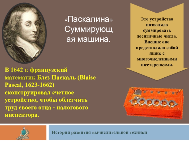 Это устройство позволяло суммировать десятичные числа. Внешне оно представляло собой ящик с многочисленными шестеренками.