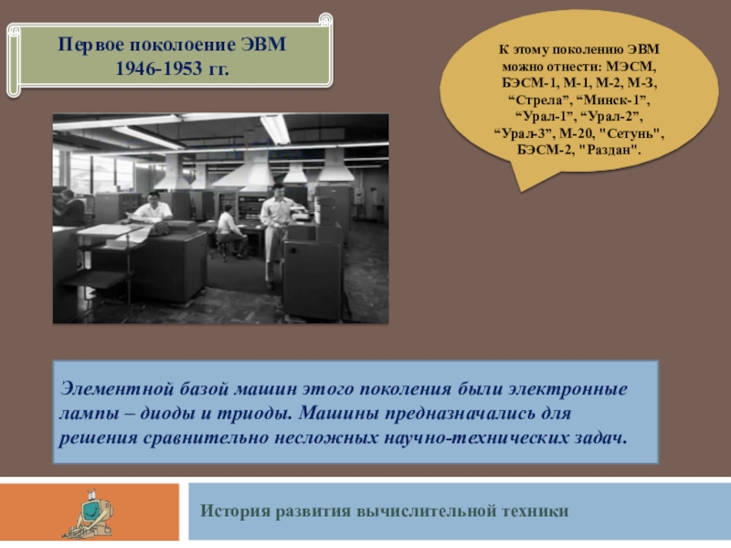 Элементной базой машин этого поколения были электронные лампы – диоды и триоды. Машины предназначались для решения сравнительно несложных научно-технических задач.