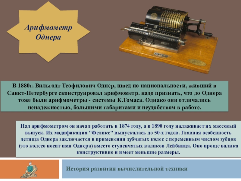 Над арифмометром он начал работать в 1874 году, а в 1890 году налаживает их массовый выпуск. Их модификация "Феликс" выпускалась до 50-х годов. Главная особенность детища Однера заключается в применении зубчатых колес с переменным числом зубцов (это колесо носит имя Однера) вместо ступенчатых валиков Лейбница. Оно проще валика конструктивно и имеет меньшие размеры.