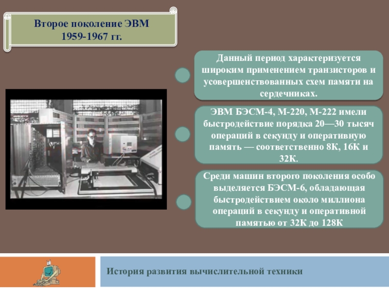 Среди машин второго поколения особо выделяется БЭСМ-6, обладающая быстродействием около миллиона операций в секунду и оперативной памятью от 32К до 128К