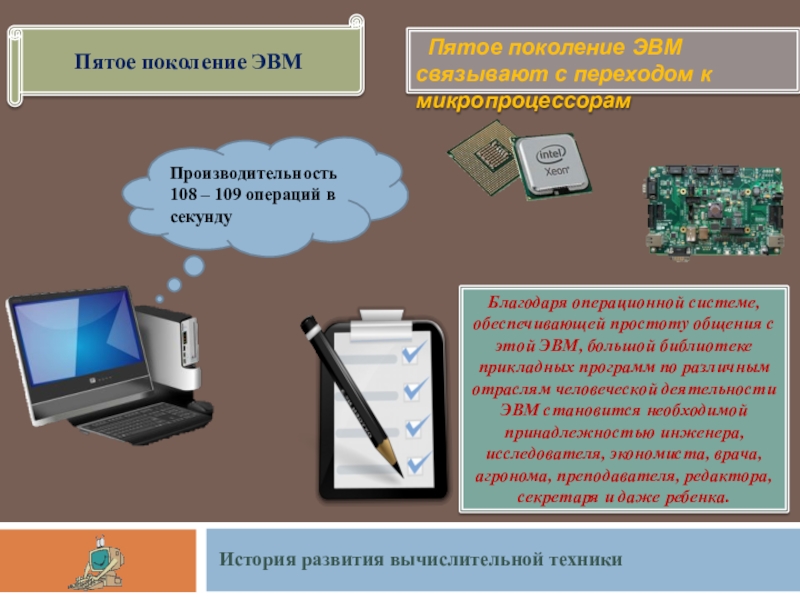 Благодаря операционной системе, обеспечивающей простоту общения с этой ЭВМ, большой библиотеке прикладных программ по различным отраслям человеческой деятельности ЭВМ становится необходимой принадлежностью инженера, исследователя, экономиста, врача, агронома, преподавателя, редактора, секретаря и даже ребенка.