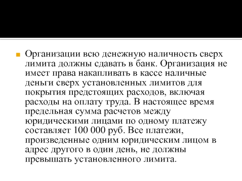 Слайд 15Организации всю денежную наличность сверх лимита должны сдавать в банк. Организация