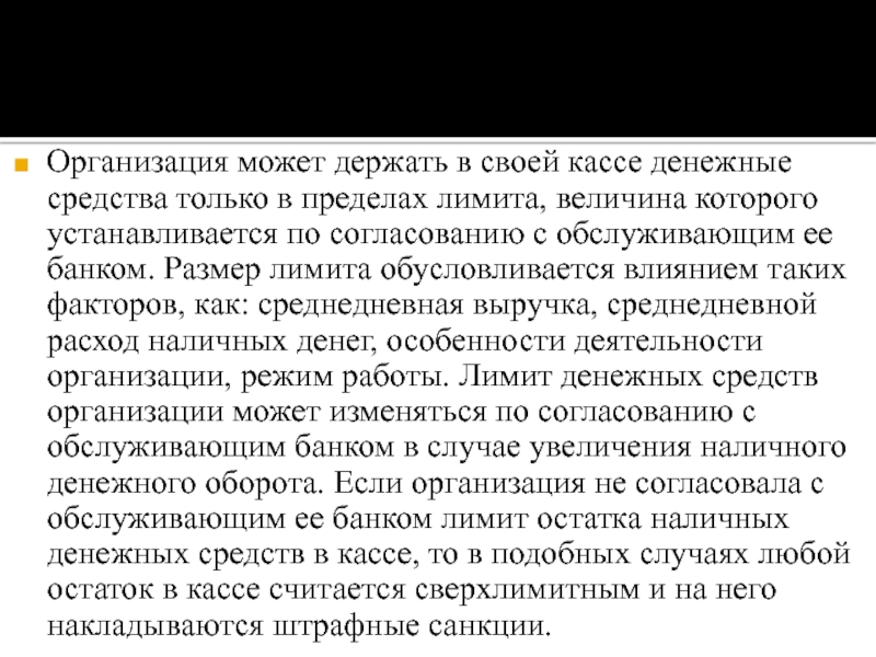 лимита, величина которого устанавливается по согласованию с обслуживающим ее банком. Размер лимита обусловливается влиянием таких факторов, как: среднедневная выручка, среднедневной расход наличных денег, особенности деятельности организации, режим работы. Лимит денежных средств организации может изменяться по согласованию с обслуживающим банком в случае увеличения наличного денежного оборота. Если организация не согласовала с обслуживающим ее банком лимит остатка наличных денежных средств в кассе, то в подобных случаях любой остаток в кассе считается сверхлимитным и на него накладываются штрафные санкции.