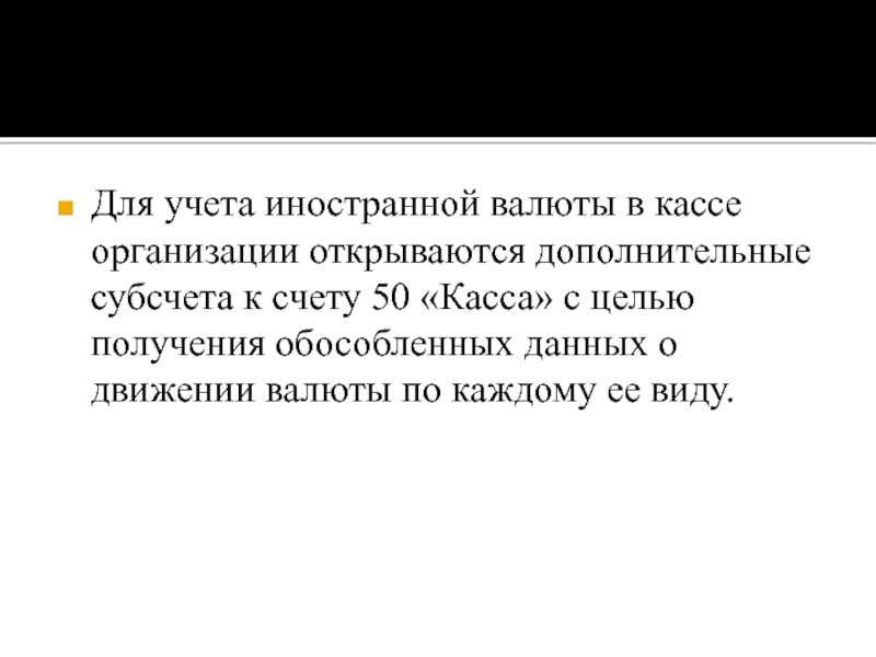 Слайд 19Для учета иностранной валюты в кассе организации открываются дополнительные субсчета к